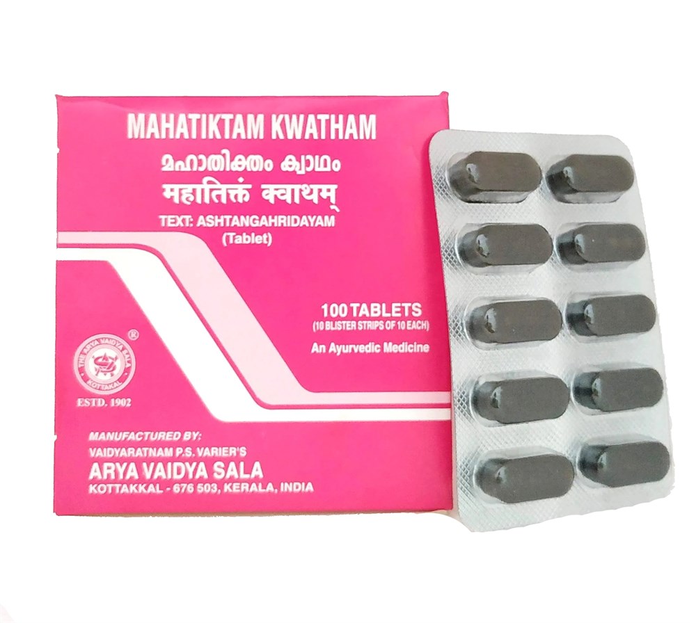 Махатиктам Кватхам - аюрведический препарат в форме таблетированного концентрированного отвара целебных трав, балансирует Питта-Доша, способствует лечению распространённых кожных заболеваний (акне, зуд, воспаление, жжение, герпес, экземы, фурункулы, пигментные пятна, незаживающие гнойные раны и др.), улучшает состояние нервной, сердечно-сосудистой системы, помогает при заболеваниях глаз и других болезнях, вызванных обострением Питты. Снижает уровень сахара в крови.