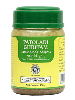 Патолади Гритам от компании Arya Vaidya Sala Kottakkal это аюрведический эликсир в форме травяного гхи. Широко используется для лечения абсцесса, лихорадки, кожных заболеваний, заболеваний уха, горла и носа и заболеваний глаз. Полезен при псориазе, экземе, дерматите, аллергической крапивнице, опоясывающем лишае. Его активно используют для подготовки к Панчакарме